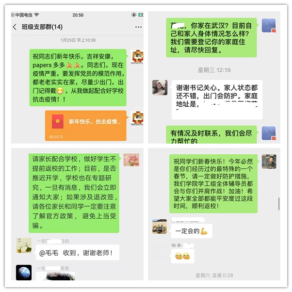 蔡振磊,人文学院辅导员,自寒假开始就没有回家,他的主要工作,就是每日排摸师生信息,并加强与学生的联系,了解每一个学生的即时状态。对湖北籍的返乡学生,蔡振磊每天都要通过微信、qq,有时直接打电话,一个个都联系上,询问他们的生活情况和精神状态,给学生讲学校防控工作的最新进展,提醒他们做好防护措施,鼓励同学们增强信心。对其他地区的学生,则通过网络广泛宣传防控措施,提醒大家注意安全。对留校的学生,蔡振磊还要戴上口罩定期走访宿舍,提醒他们做好健康监测和每日报告。“其实不只我一个人,全校的辅导员和副书记们都在岗位上。虽然寒假没有回家,但没一个人推脱,学生的健康是第一位的。”蔡振磊如是说。